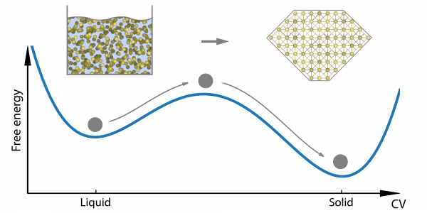 Crystallisation, they continue, is “a remarkable physical process” in which “rare but crucial fluctuations lead to the formation of a solid phase starting from the liquid”. For computer simulations, the trouble comes with the ‘rare but crucial fluctuations’ part: it means that in most cases the time scale of crystal nucleation is much longer than what can be reached in atomistic simulations.