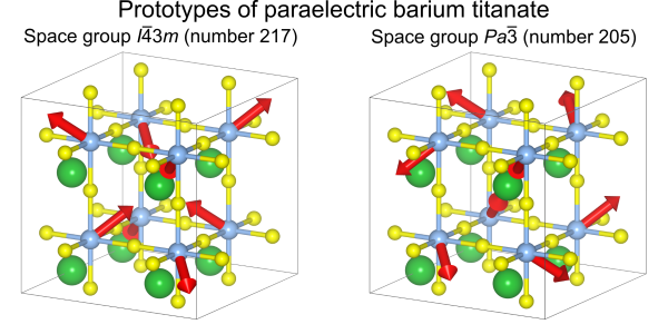 Figure 1: The two prototypes for cubic paraelectric barium titanate identified using the symmetry analysis based on group-subgroup relations in tandem with first-principles calculations detailed in the work of Kotiuga et al. These prototypes, both energetically and dynamically stable, can serve as minimal microscopic models of the paraelectric phase as they provide a faithful microscopic representation with key features: the persistence of local titanium displacements and the appropriate macroscopic point group. The barium, titanium, and oxygen atoms are shown in green, blue, and yellow, respectively. The red arrows indicate the direction of titanium displacements. For clarity, the oxygen displacements are not displayed.