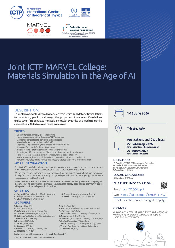 The two-week programme includes lectures and hands-on sessions on electronic-structure and atomistic simulations to understand, predict, and design material properties. It includes keynote talks and lectures by distinguished scientists (see poster attached) and covers first-principles methods, molecular dynamics simulations, and machine-learning approaches. The programme will also feature two poster sessions, one in each week, where participants can present and discuss their work, and open-mic sessions to brainstorm together.